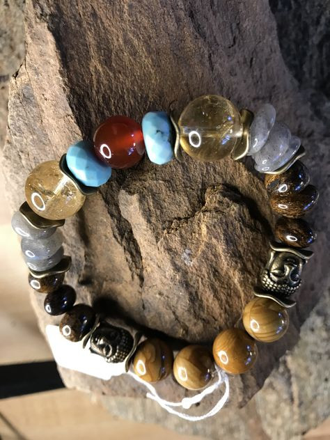 This Buddha-inspired bracelet is a one of a kind, handcrafted by one of our owners! All proceeds go to the local program F.I.S.H., which provides charity-based goodwill services to those in need in Elko County, Nevada. What makes this bracelet special? Well, look no further than its star bead, crafted of red citrine. The earthy tones contrasted with the turquoise blues make for a studding visual art that you'll be happy to wear anywhere!